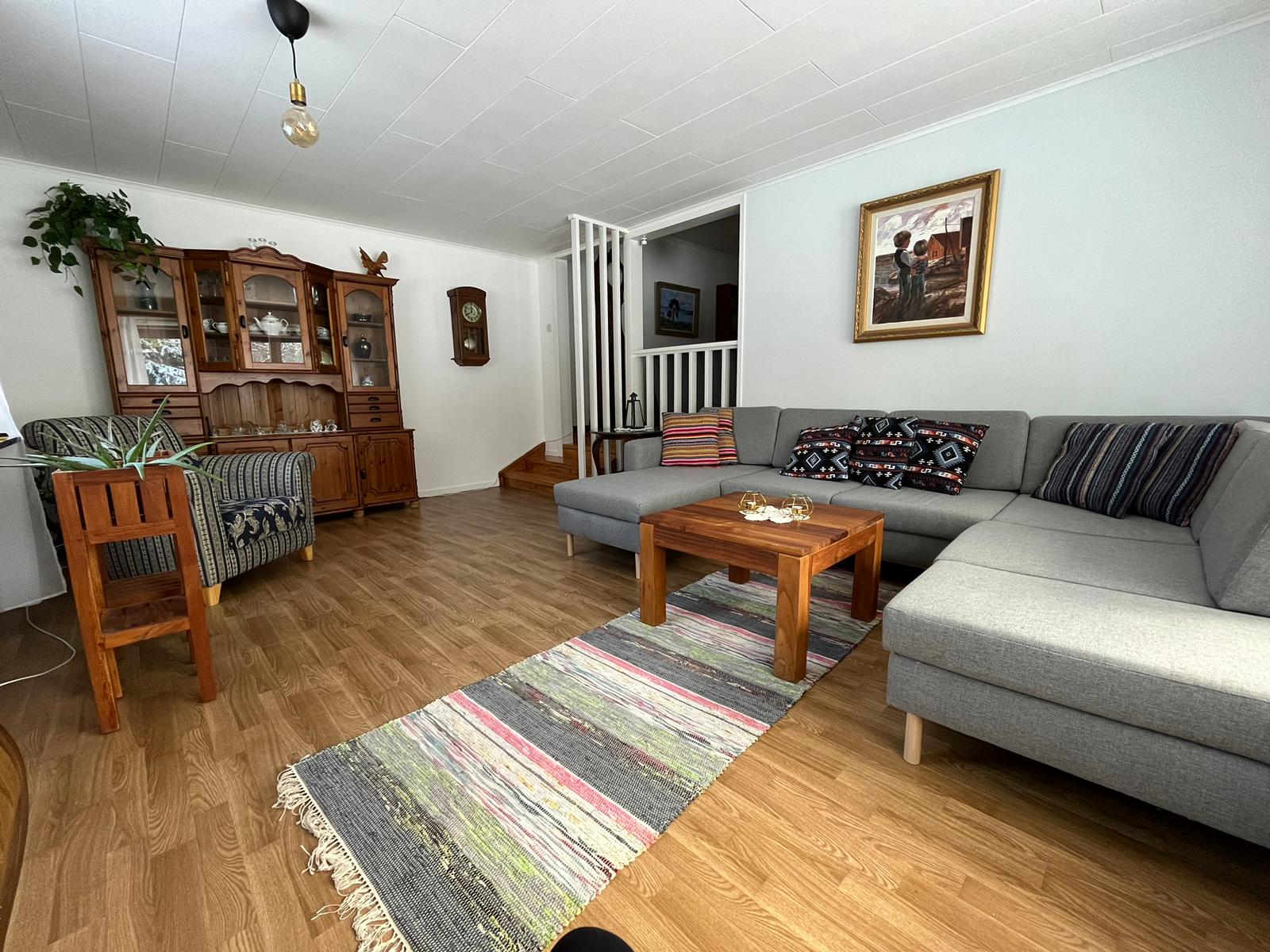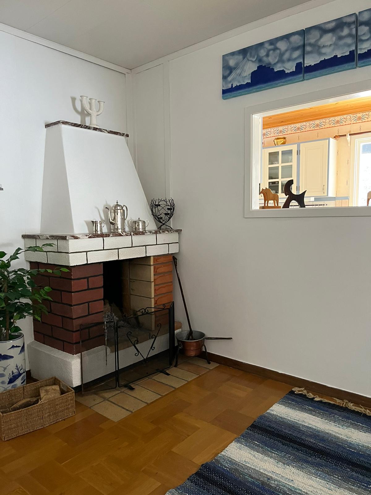 The house has a living room with tv and large relax sofa, a smaller living room with fireplace. Two bedrooms, one bedroom with double bed and the other with two single beds.